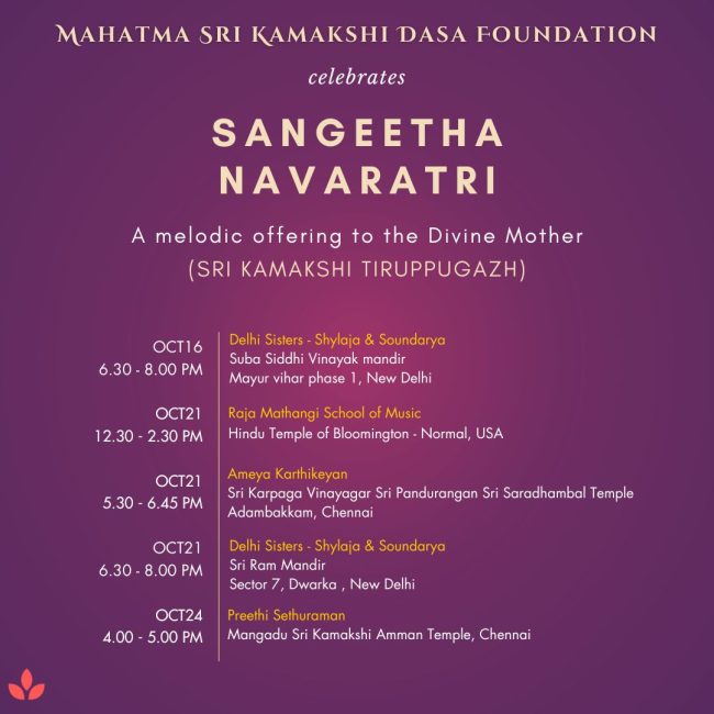 Please join us from your nearby locations and celebrate this Navaratri with soul stirring renditions on the Divine Mother.