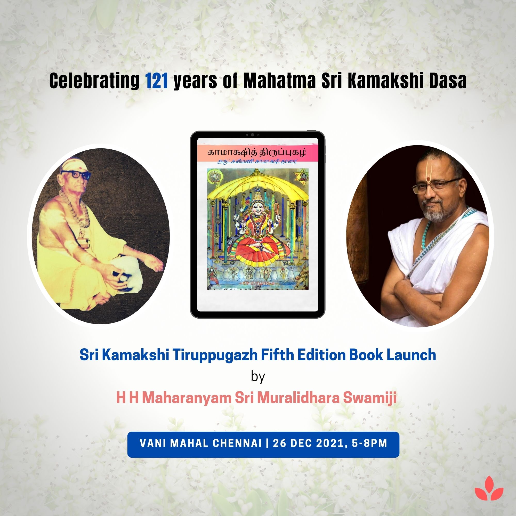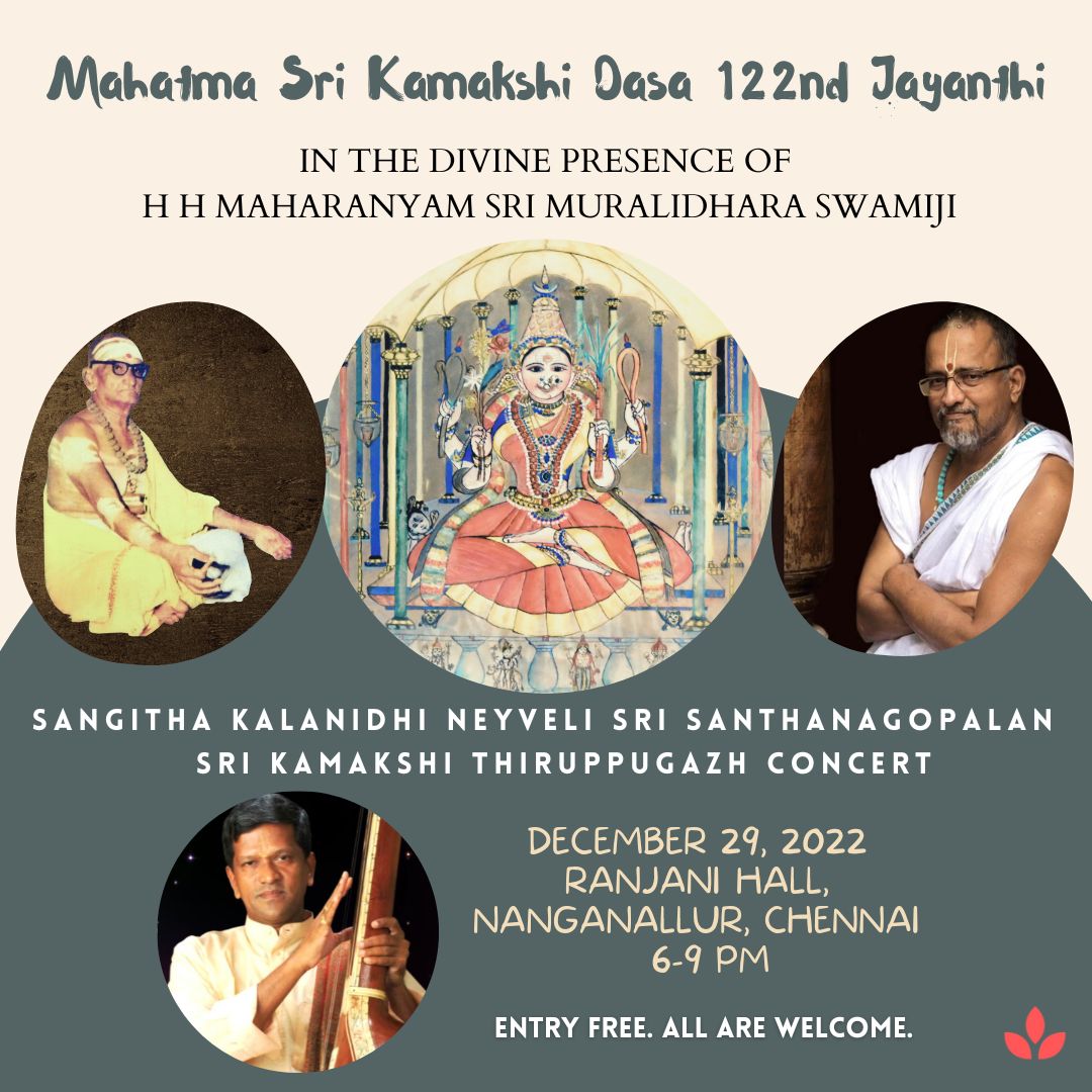 Mahatma Sri Kamakshi Dasa 122nd Jayanthi will be celebrated on Dec 29, 2022 at Ranjani Hall, in the divine presence of H H Maharanyam Sri Muralidhara Swamiji. Special concert of Sri Kamakshi Tiruppugazh by Sangitha Kalanidhi Neyveli Sri Santhanagopalan and supporting artists. Entry Free. All are welcome!